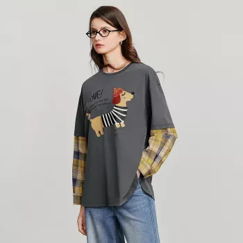 Women’s Autumn Cotton Printed Hoodie with Spliced Sleeves & Round Neck